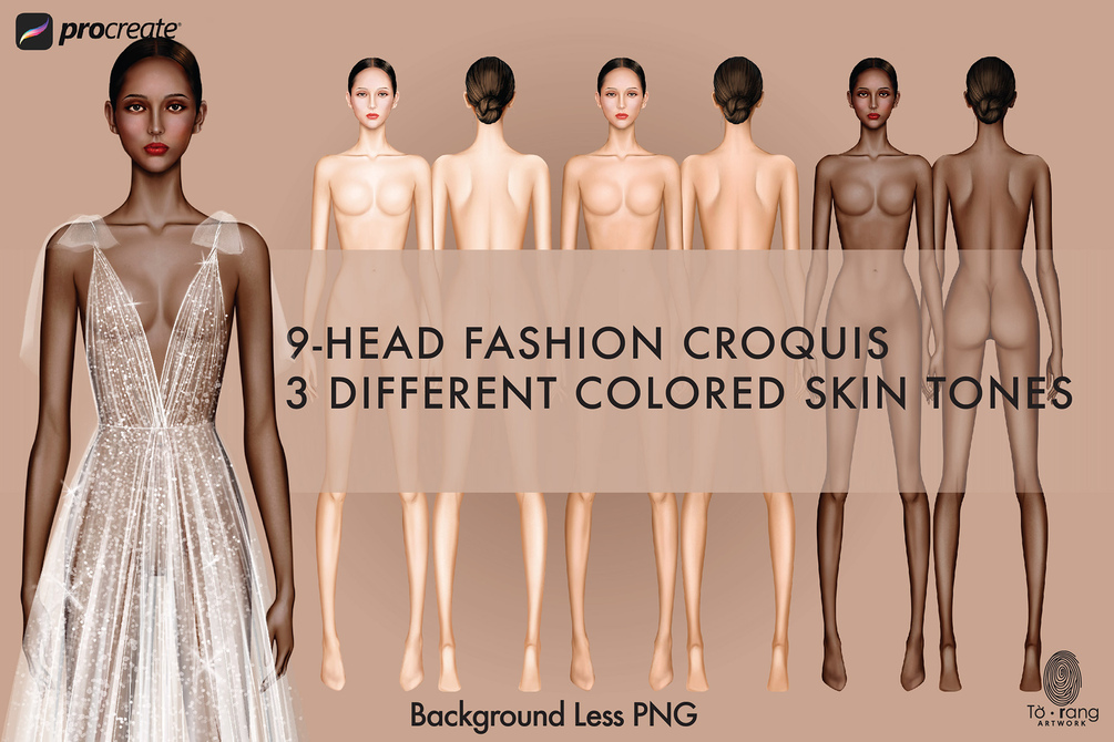 Female Fashion Croquis Templates, Front and Back, 3 Different Colored Skin Tones, 9-Head Fashion Figure