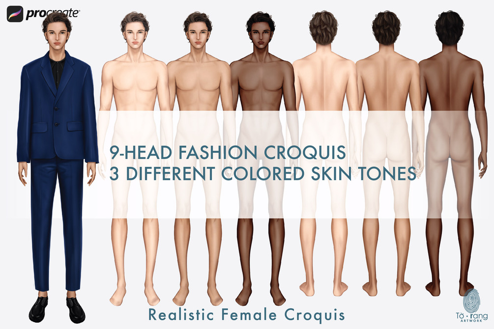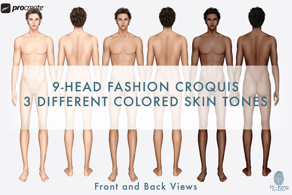Male Fashion Croquis Templates, Front and Back, 3 Different Colored Skin Tones, 9-Head Fashion Figure, Fashion Illustration